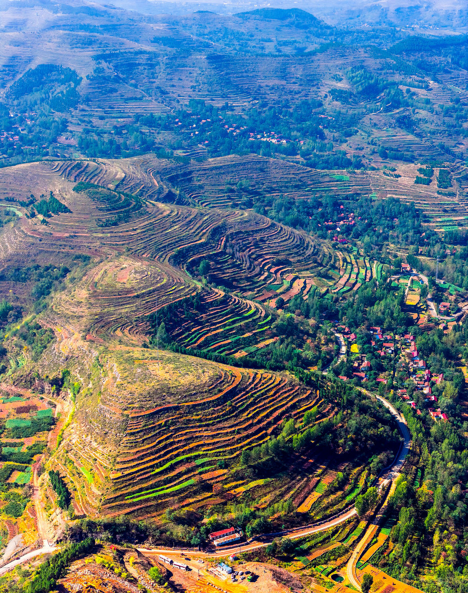 金秋十月,沂蒙山腹地的沂水县高庄镇迎来了一年中最绚烂的时刻。层层梯田如大地的指纹般蜿蜒盘旋,与白墙彩瓦的村落交相辉映。炊烟袅袅,群山叠翠,流云舒卷,构成一幅意境深远的山水画卷。这里尚未被过度开发,保留着原始而质朴的美,被誉为“藏于人间的一片处女地”。