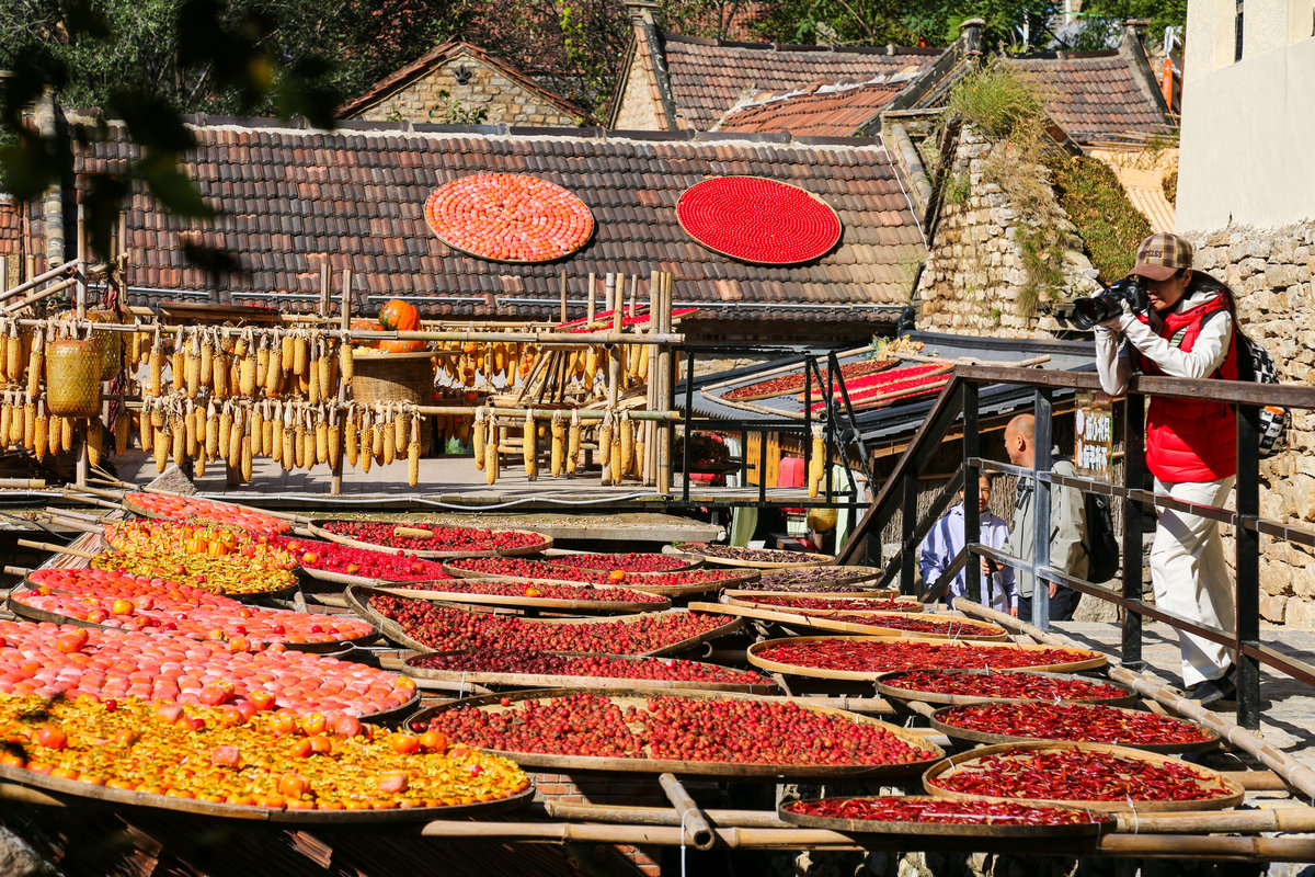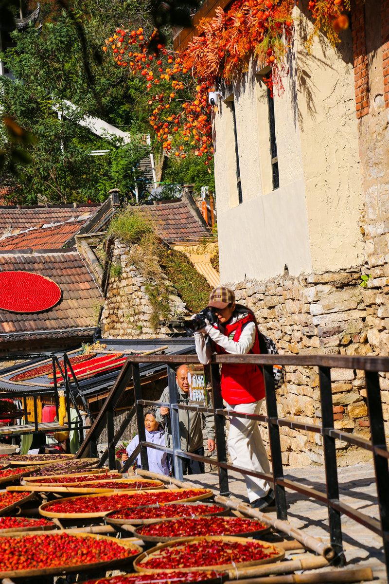 色彩在这里有了生命的分量。辣椒的红是带着声响的,噼里啪啦烧透半面山崖;玉米的黄却温厚,像把三季的阳光都沉淀在了籽粒里。黑瓦石墙的沉静,恰好托住了这满山满谷的绚烂——原来最动人的艺术,本就生长在炊烟升起的地方。
