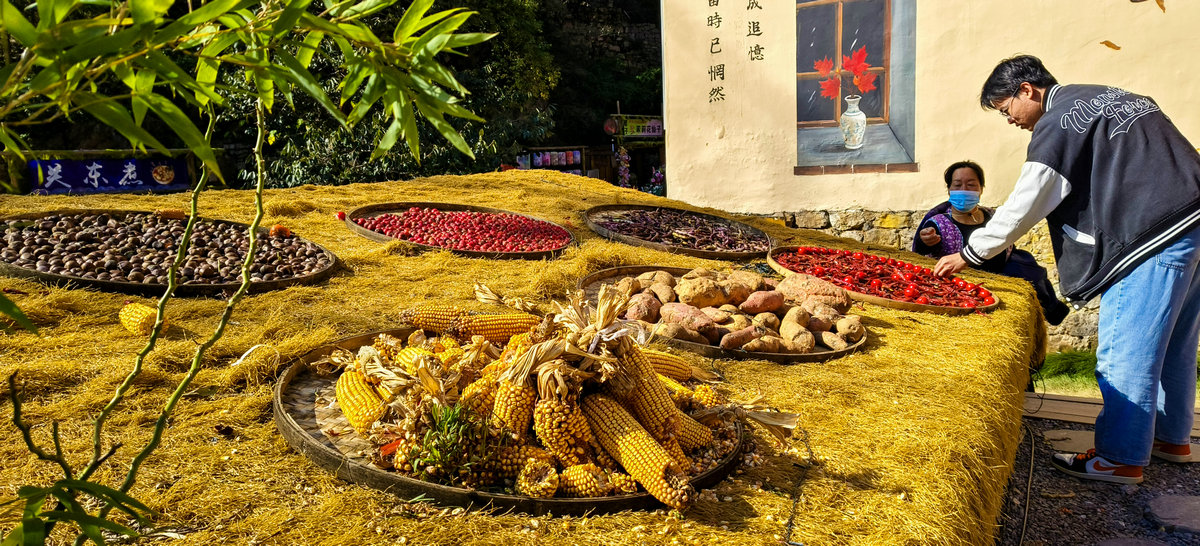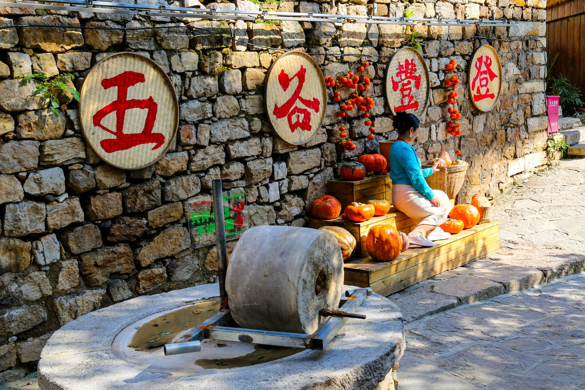 石板路泛着温润的光,百年时光把每块石头都磨成了镜子。柿子树枝桠遒劲,缀满的小灯笼在秋风里轻颤,像是给这场秋日盛宴点起的暖黄灯火。转过墙角,晒秋的盛景豁然摊开:辣椒串成的流苏从屋檐垂下,玉米辫织成的金帘遮了半面石墙,圆滚滚的南瓜在院坝里叠成宝塔。更有切丝的南瓜晾在竹匾里,那橙黄在阳光下透出蜜样的光泽。