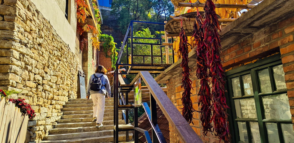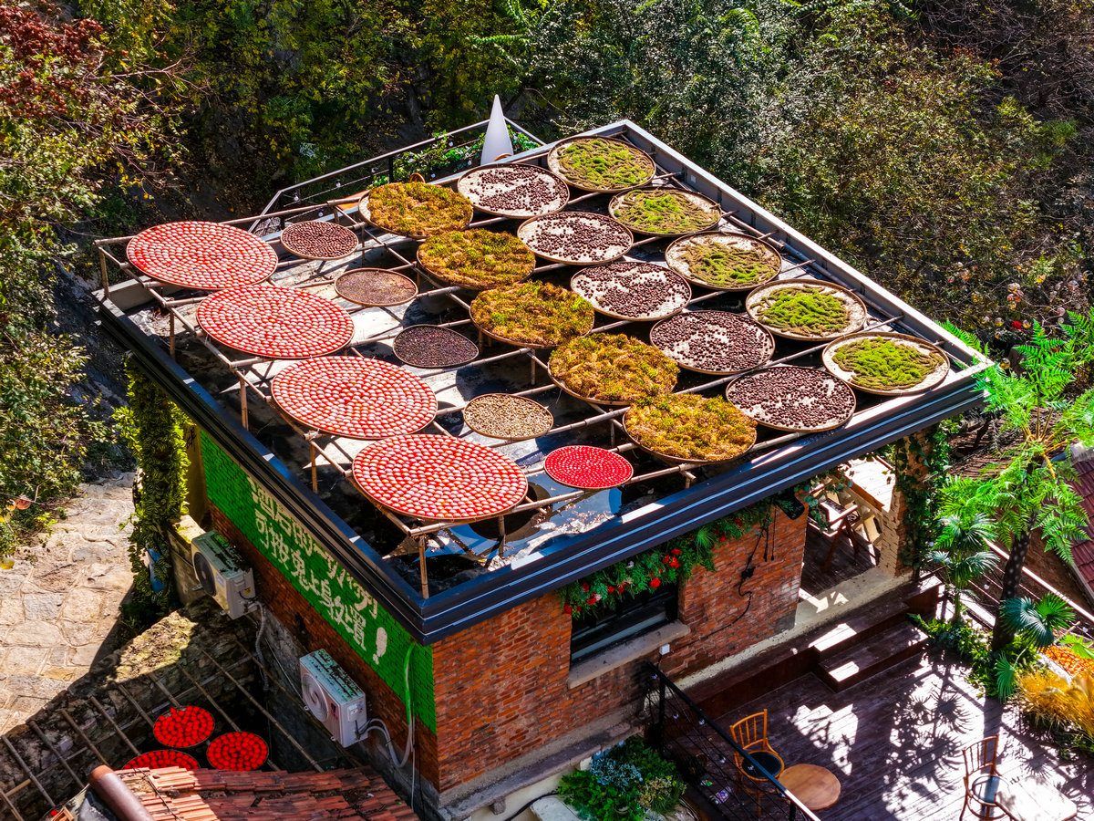 行至山腰回望,发现这晒秋竟是立体的诗篇。竹匾依山势层层铺展,像巨幅卷轴正被秋风徐徐翻开。山中古村晒着人间烟火,辣椒玉米都是过冬的底气;山上云台却添了艺术装置,秋千在云雾间轻荡,仿佛真要带着丰收的喜悦飞向天际。这“山下”与“云上”的两重秋光,让柿岩的晒秋既接了地气,又生了仙意。