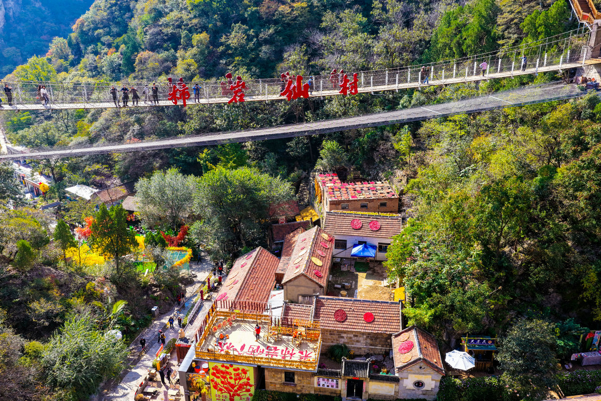 在淄博市博山区群山间盘旋,忽见峡谷深处浮起一片斑斓——那不是寻常秋色,而是一座古村用整个丰收季调出的浓彩。青石墙、黑瓦片为底,玉米的金黄、辣椒的艳红、南瓜的橙黄肆意挥洒,宛如天神打翻了调色盘。这便是红叶柿岩,一个用最朴实的丰收元素绘就的秋日童话。