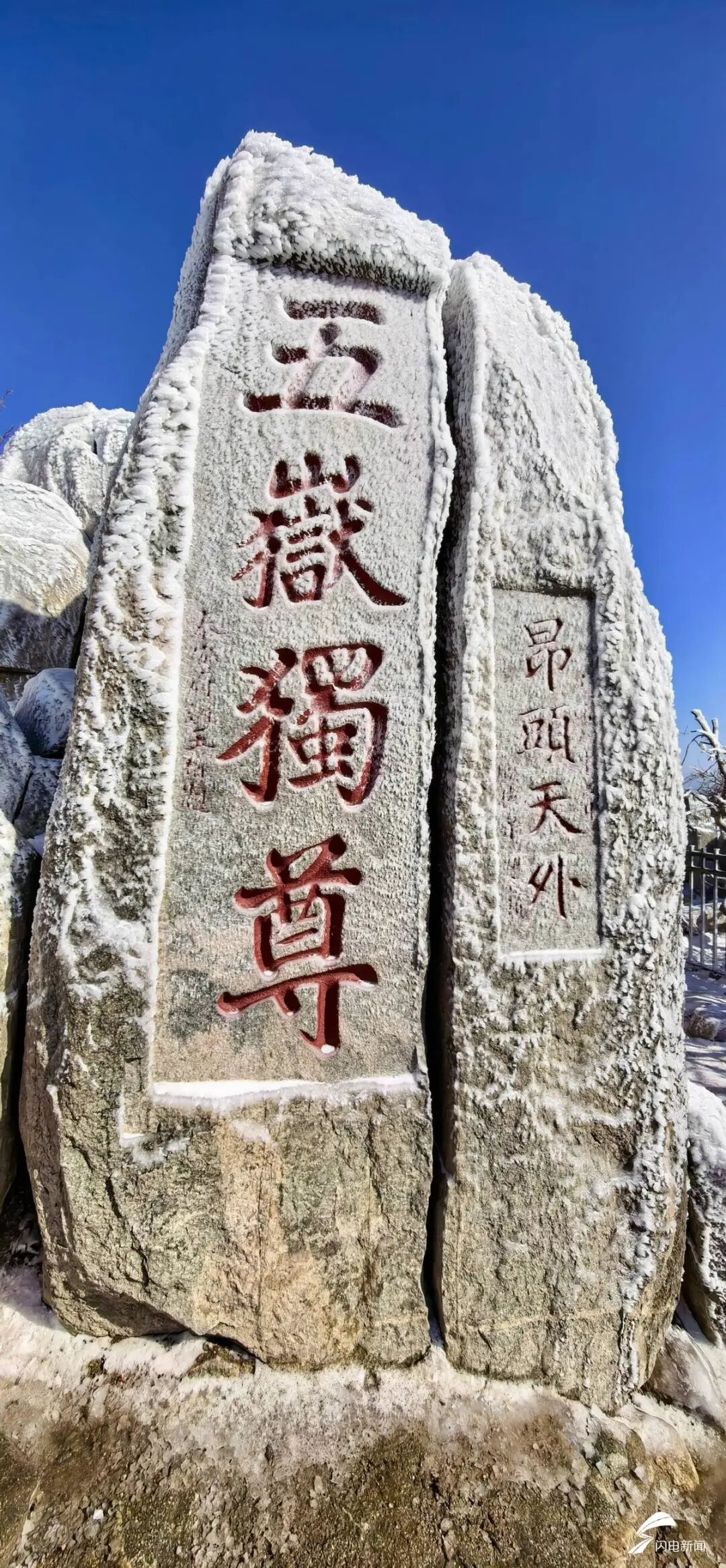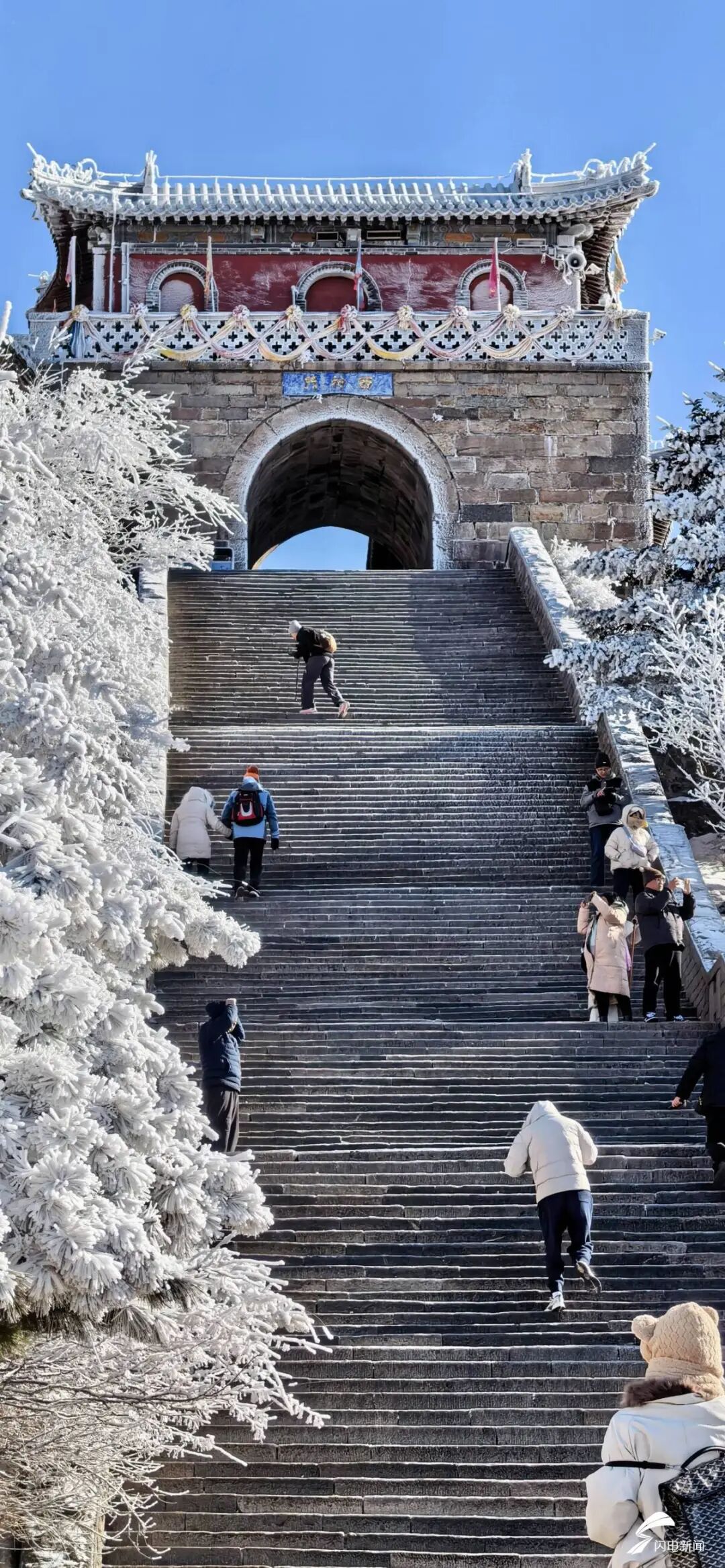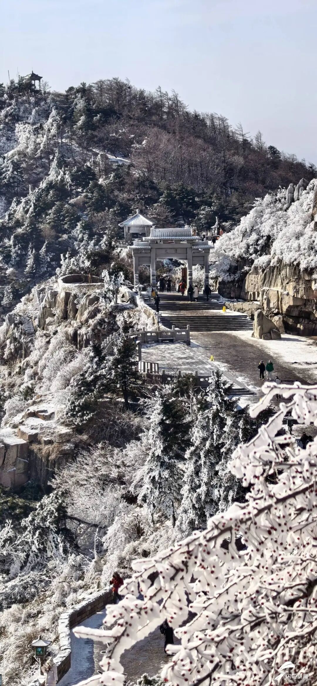 举目四望,峰峦隐在薄雾里,若隐若现,唯有这一树树雾凇,白得耀眼,美得惊心,树枝上的冰宛如透明的琉璃,在阳光下光彩夺目。石阶上积着薄雪,踩上去咯吱作响,与松涛的低吟交织在一起。偶有几只山雀掠过枝头,惊落一片碎玉,簌簌的声响里,更衬得这岱顶雪境,静谧得如同仙境。