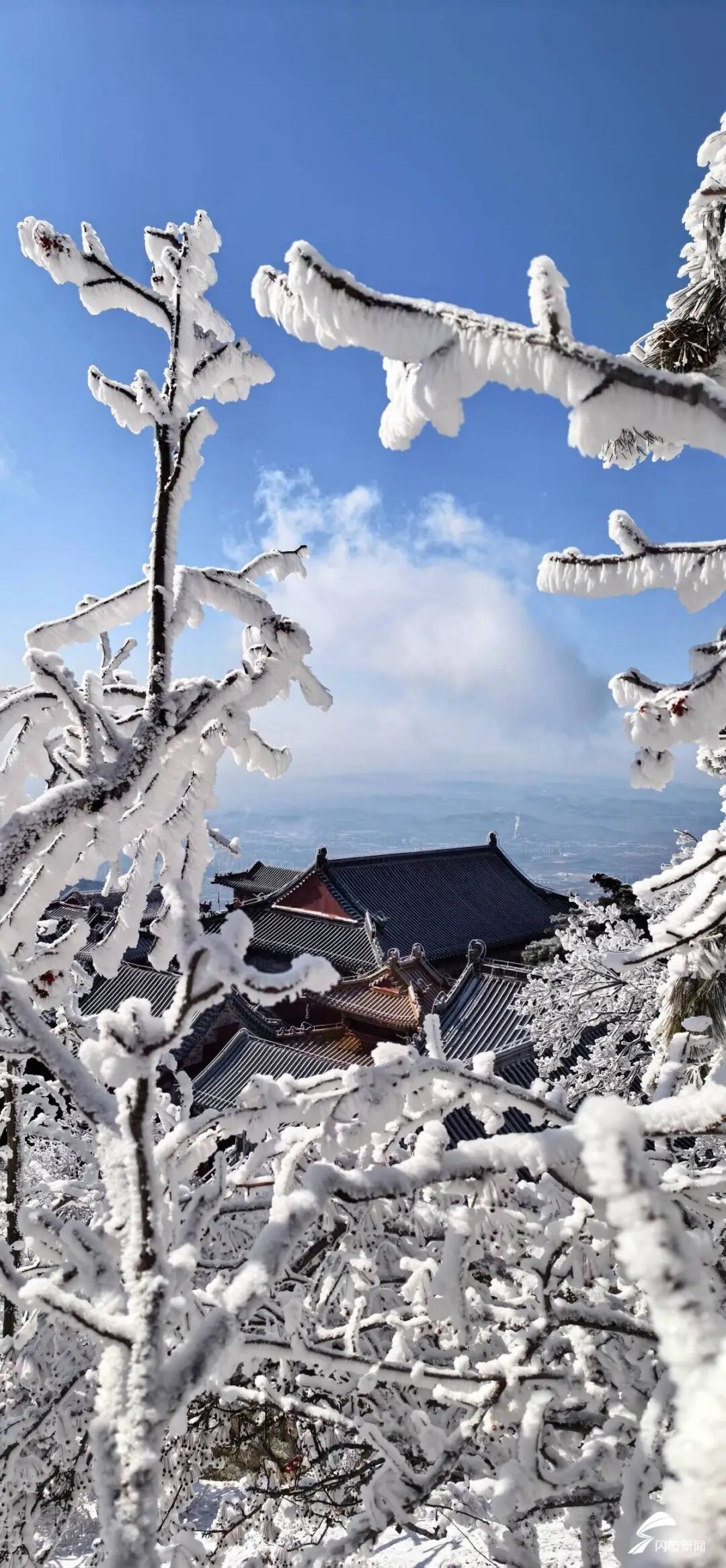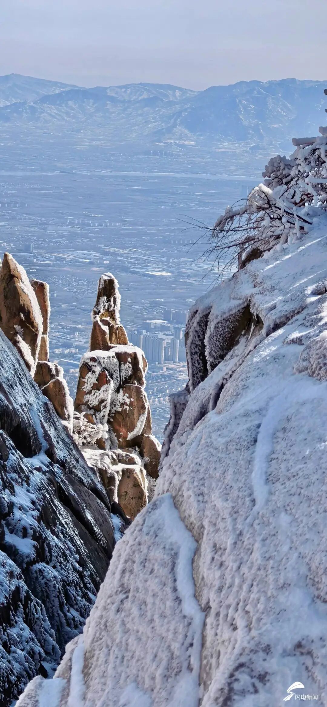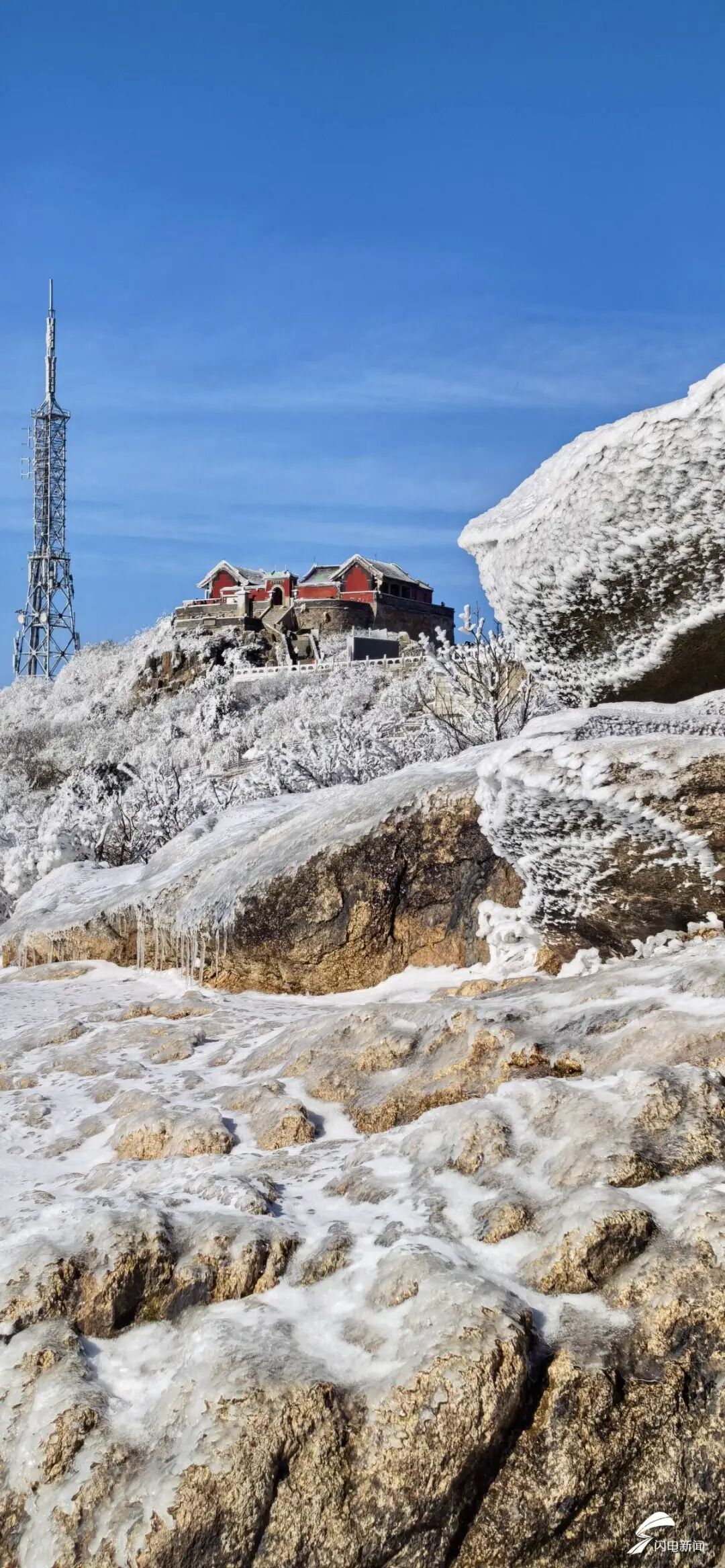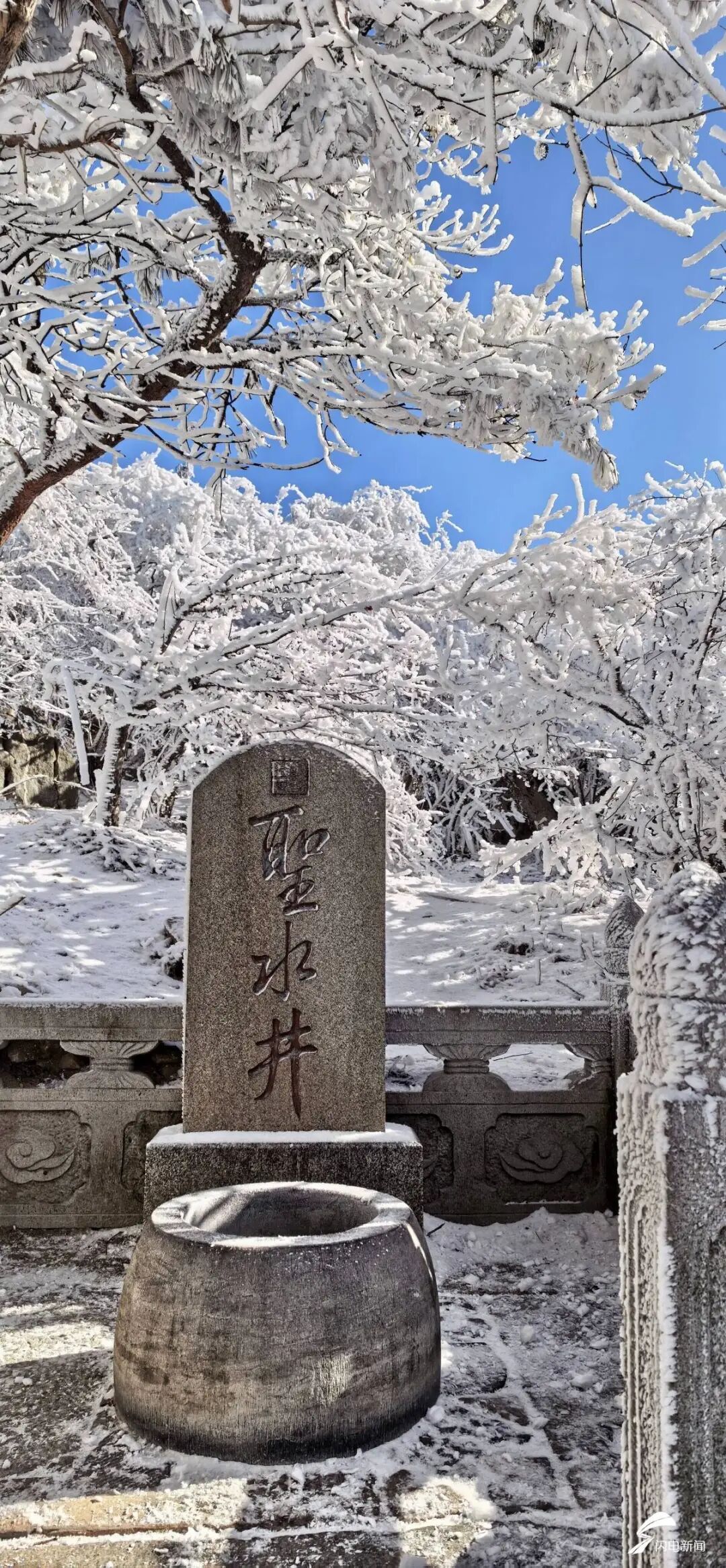 举目四望,峰峦隐在薄雾里,若隐若现,唯有这一树树雾凇,白得耀眼,美得惊心,树枝上的冰宛如透明的琉璃,在阳光下光彩夺目。石阶上积着薄雪,踩上去咯吱作响,与松涛的低吟交织在一起。偶有几只山雀掠过枝头,惊落一片碎玉,簌簌的声响里,更衬得这岱顶雪境,静谧得如同仙境。