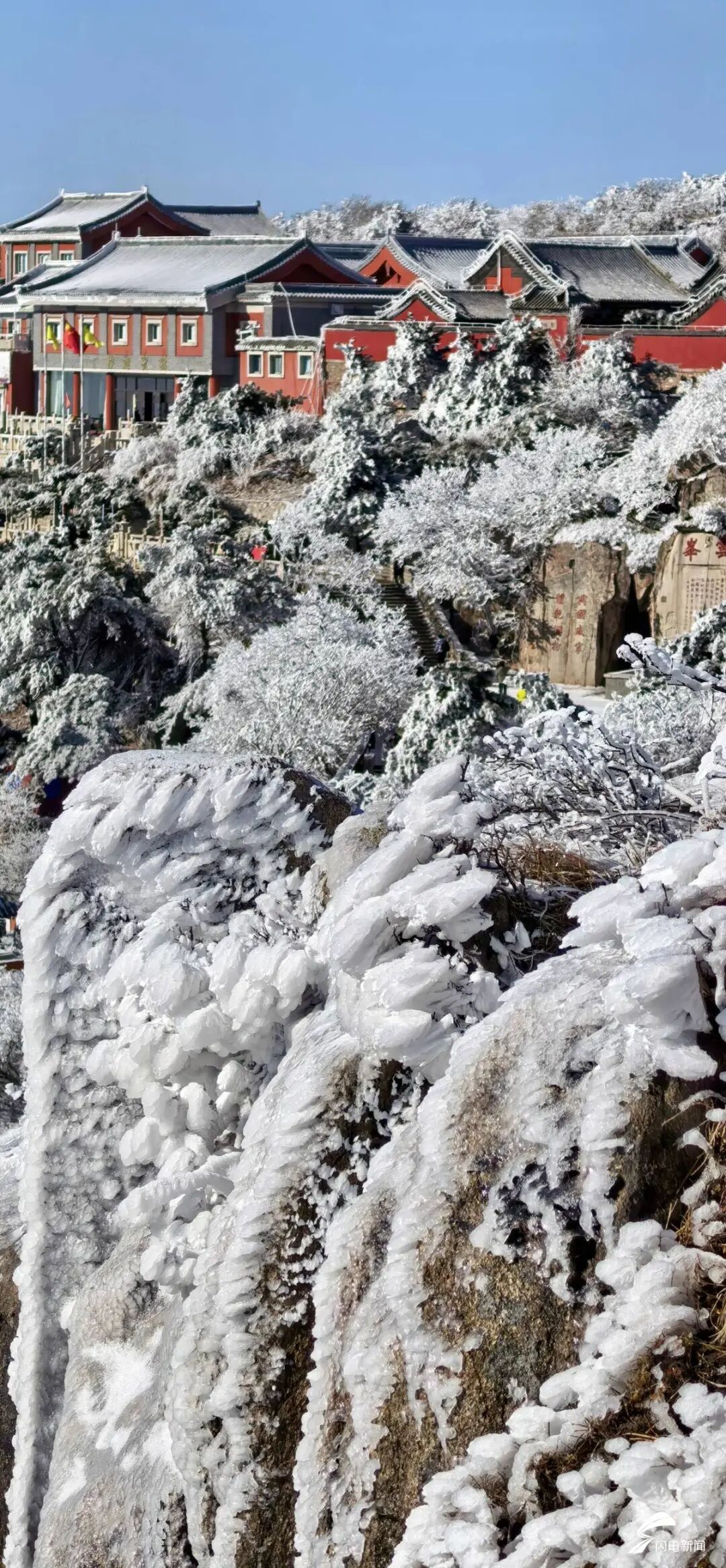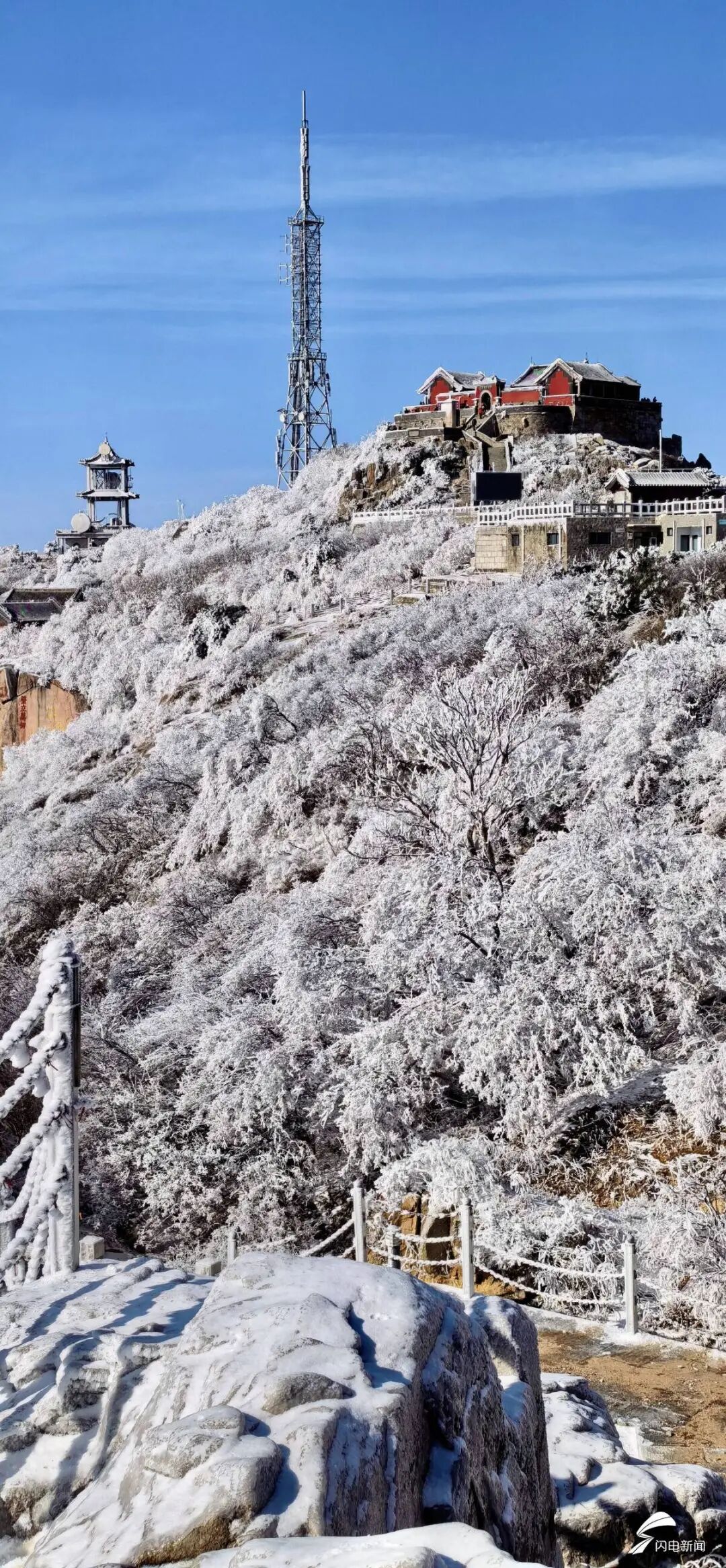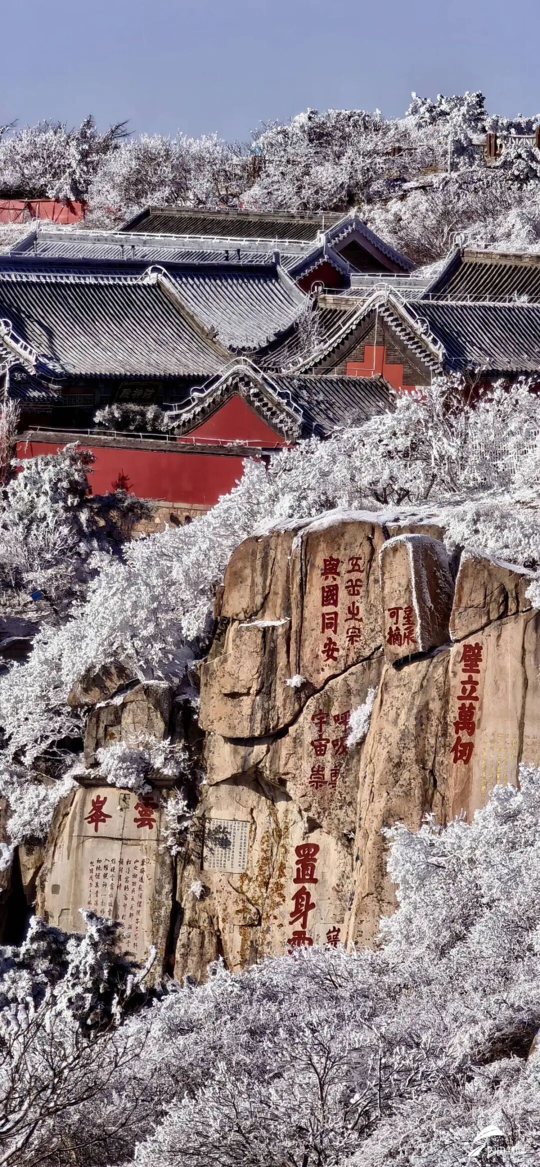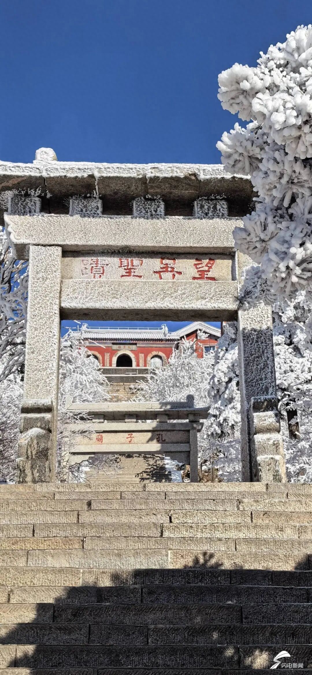 一夜寒风拂过,漫山的松柏都披上了晶莹的铠甲,这便是岱顶的雾凇。