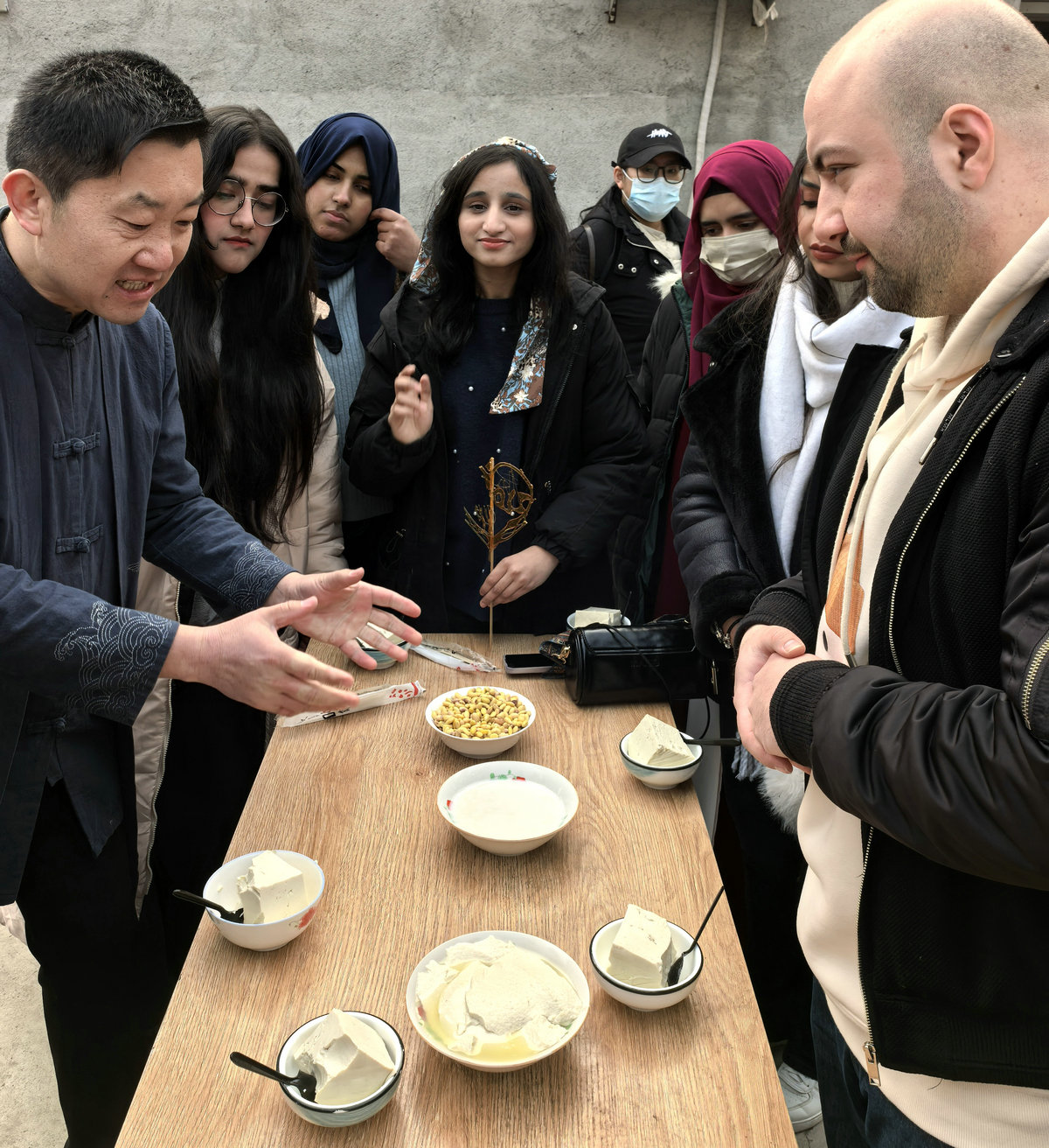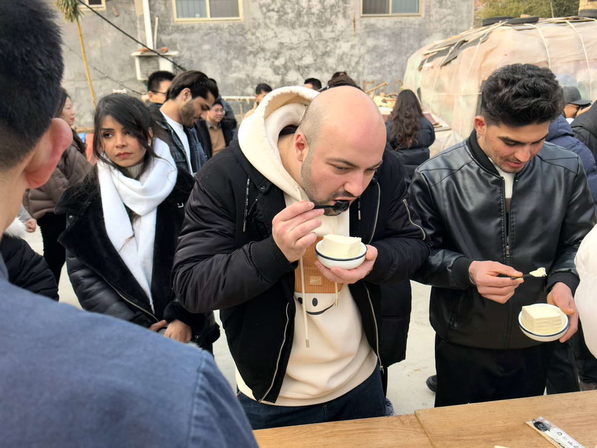 非遗豆腐工坊内,石磨轻推,乳白浆液缓缓流淌。传承人王小刚详解“腊月二十五,推磨做豆腐”的民俗渊源,留学生轮番上阵体验磨浆、滤渣、点卤、压制成型全过程,方知一方嫩滑豆腐需经十数道工序。