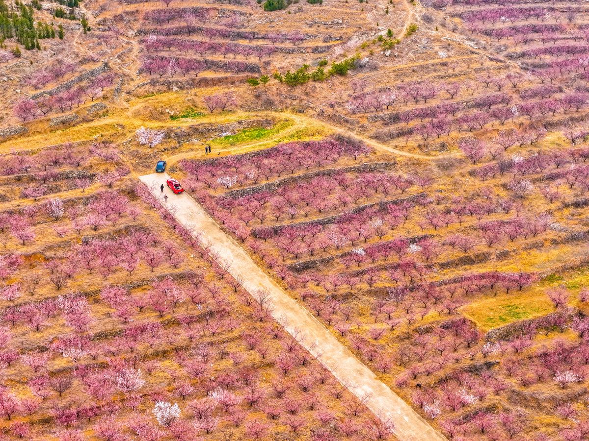 步入村庄,但见农家小院的墙头屋角,一树树繁花探出,与青瓦石墙相映成趣,生活气息与盎然春意在此交融。拾级而上,那依山就势开垦出的层层梯田,仿佛为大地铺上了柔美的粉白色缎带。杏树沿着田垄整齐列队,繁花如瀑般倾泻而下,勾勒出大地最优美的曲线。