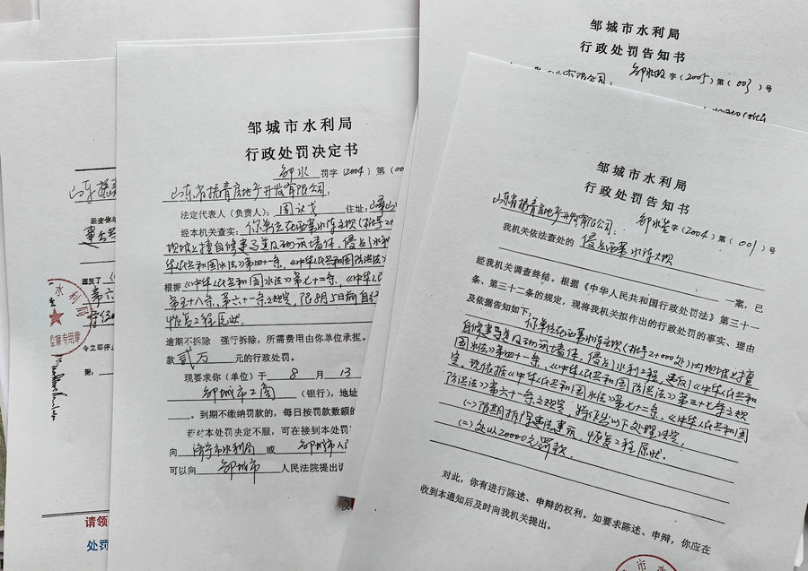 就是这样一个经过省市县级水利部门层层审核批准的项目,自2004年4月到同年10月份,短短半年时间内,邹城市水利局却连续向振青公司下达违法行为通知书、行政处罚决定书、告知书等书面通知书11份,千方百计地阻挠施工,严重影响了施工进度,错过了汛期之前完工的时机。