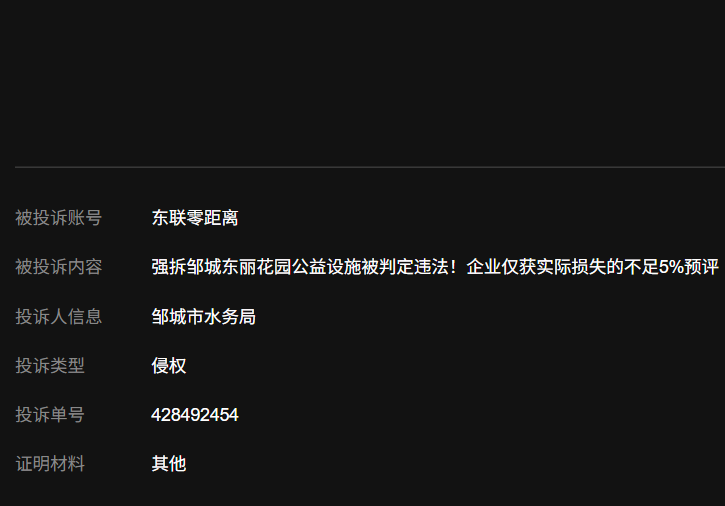 投诉中说:帖文称“山东振青房地产公司投资建设的东丽花园孟子湖水陡隔离副坝遭强拆”等内容与事实不符。经核实,视频所指的“隔离副坝”建筑物系违法违规构筑物,为确保河道行洪畅通及广大人民群众生命财产安全,我单位严格履行法定职责,对影响防洪安全的违法建筑设施实施的依法清除工作,前期已依法发布《关于清理西苇水库管理范围内非法建筑设施的通告》,明确规定清除范围及要求,视频中“强拆”表述与事实不符,易误导公众认知。