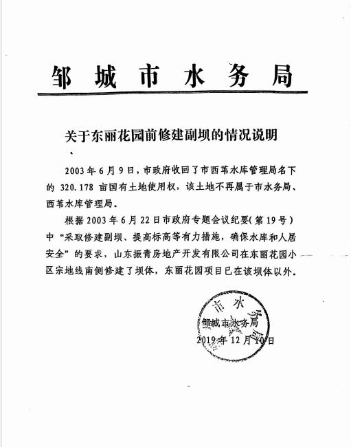 时间到了2019年12月10日,邹城市水务局出具了书面《关于东丽花园前修建副坝的情况说明》,明确说明:2003年6月9日,市政府收回了西苇水库管理局名下的320.178亩国有土地使用权,该土地不再属于市水务局、西苇水库管理局。同时,承认振青公司按照2003年6月22日市政府专题会议纪要(第19号)的要求,已经在东丽花园小区南侧修建了坝体。
