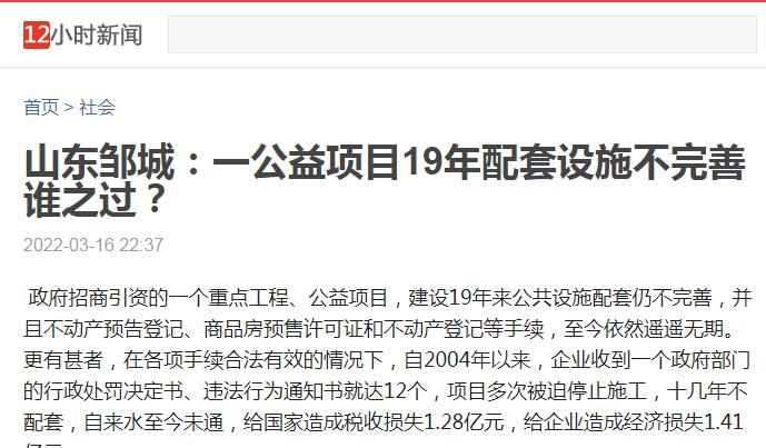 政府招商引资的一个重点工程、公益项目,建设19年来公共设施配套仍不完善,并且不动产预告登记、商品房预售许可证和不动产登记等手续,至今依然遥遥无期。更有甚者,在各项手续合法有效的情况下,自2004年以来,企业收到一个政府部门的行政处罚决定书、违法行为通知书就达12个,项目多次被迫停止施工,十几年不配套,自来水至今未通,给国家造成税收损失1.28亿元,给企业造成经济损失1.41亿元。