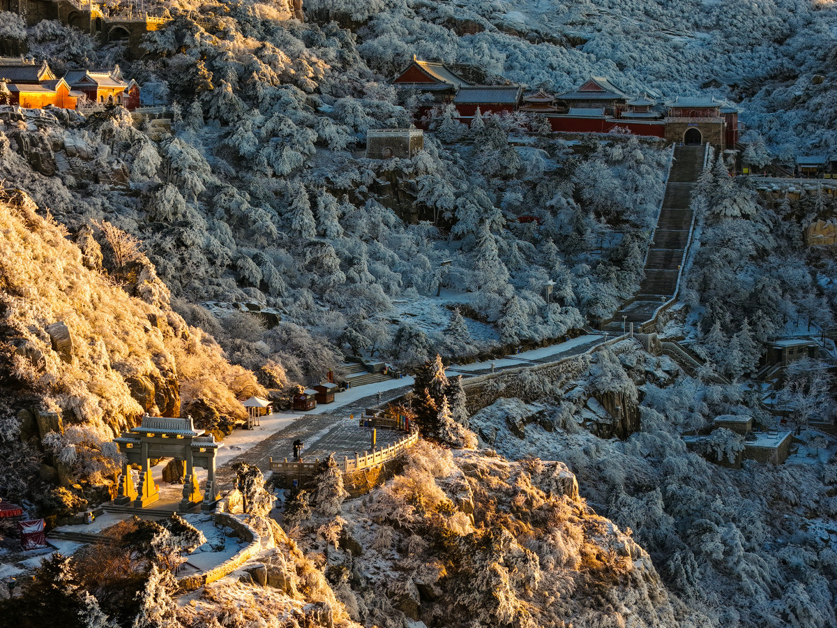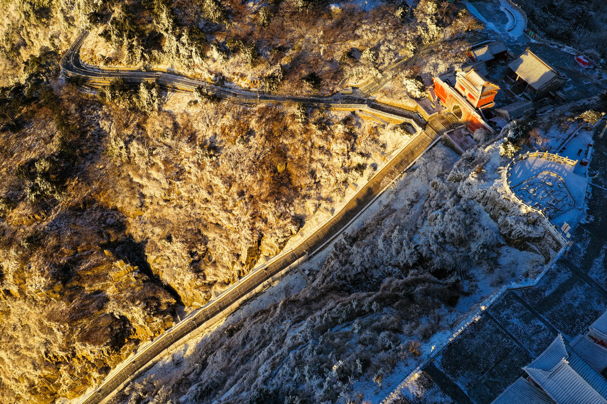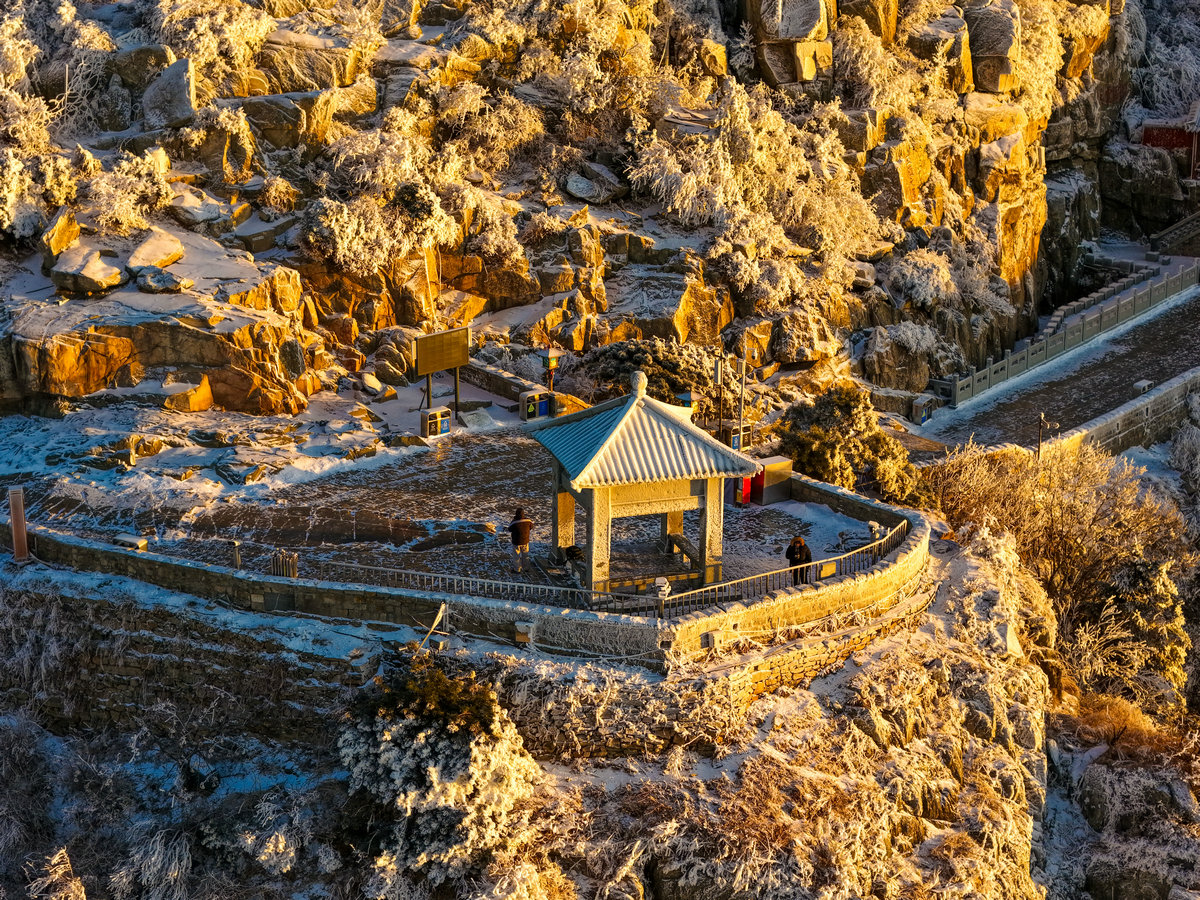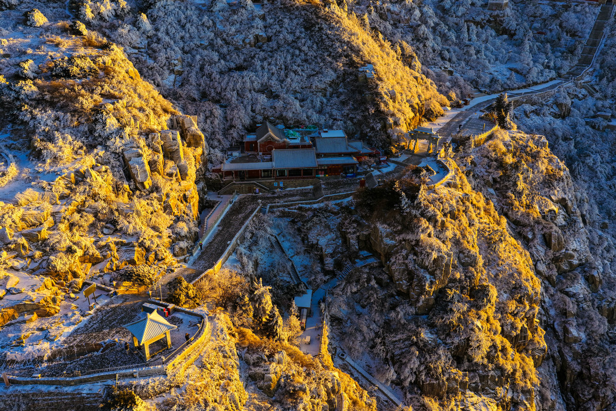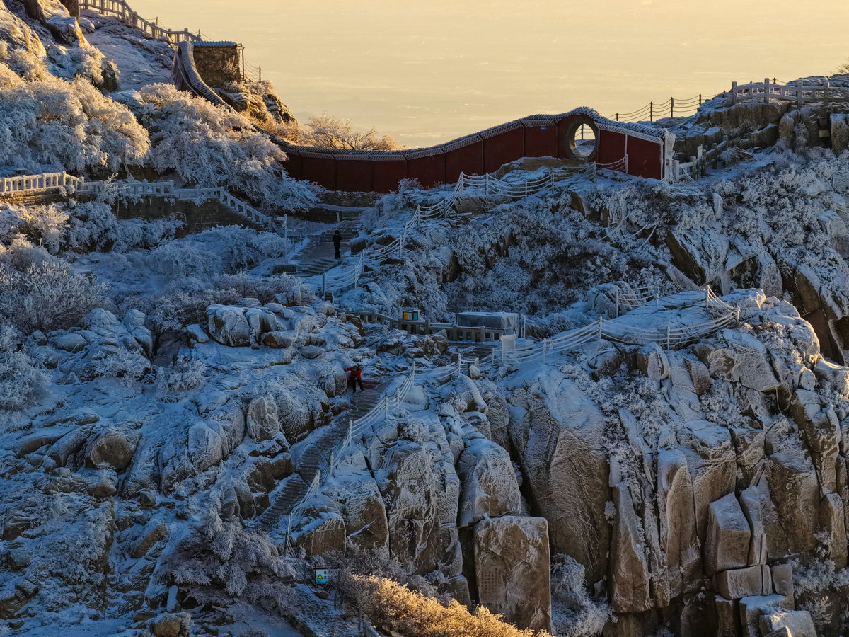 雪后的阳光泼洒在覆着雾凇的泰山之巅,深褐的岩峰被镀上一层柔润金边,霜花裹覆的草木折细碎的晶光,连蜿蜒的山间步道也浸在暖色调里,与未融的残雪形成明暗交织的纹理。