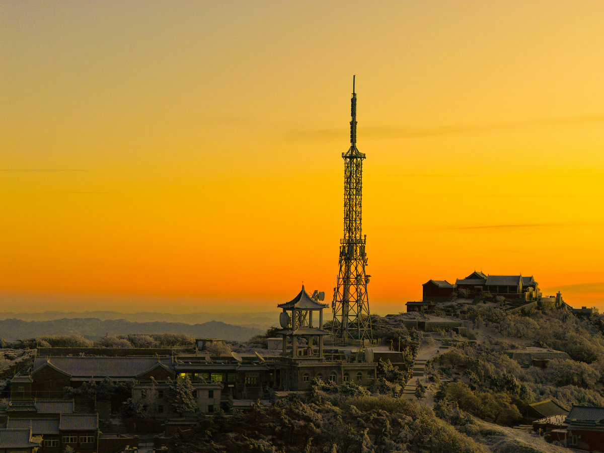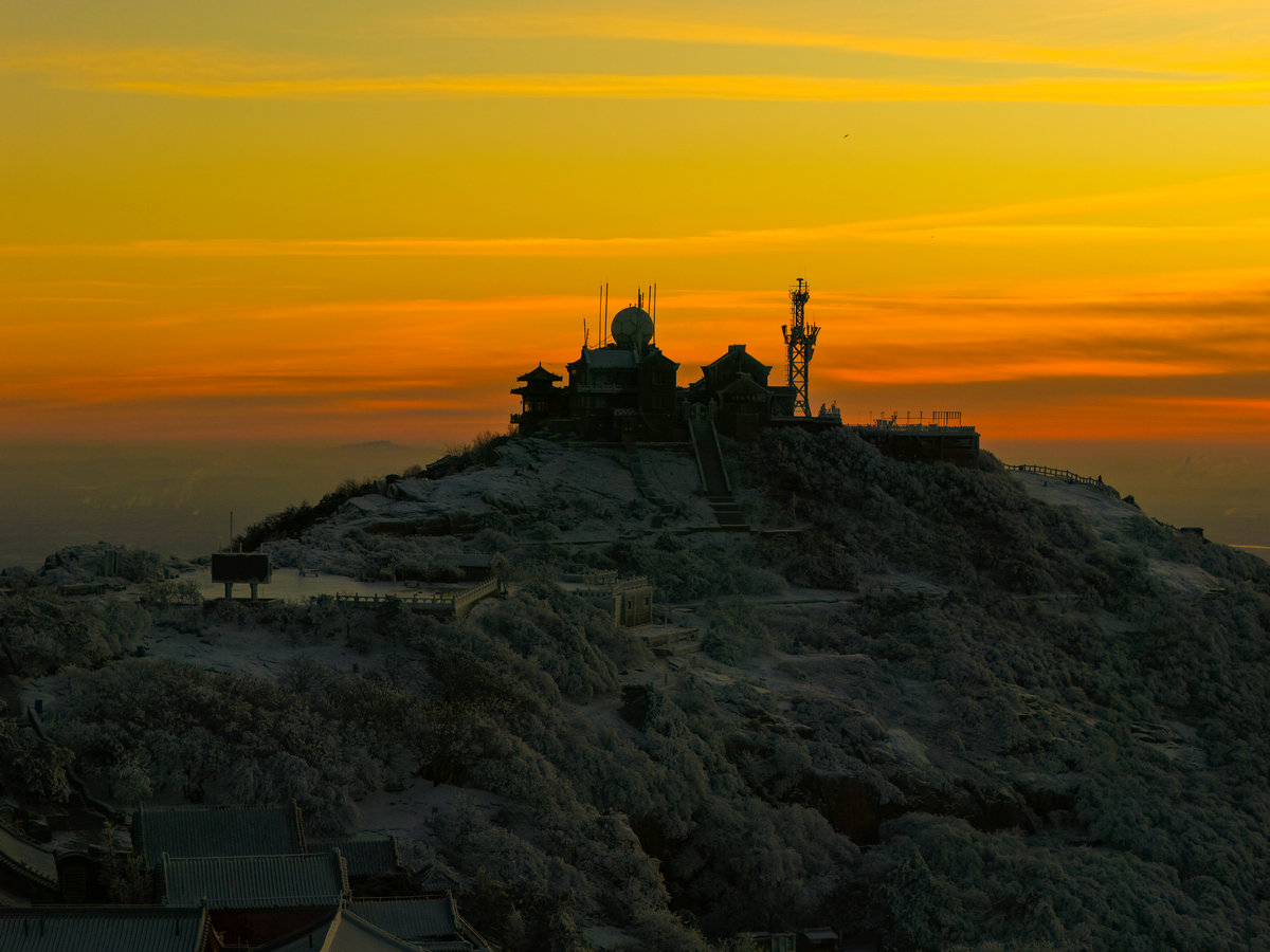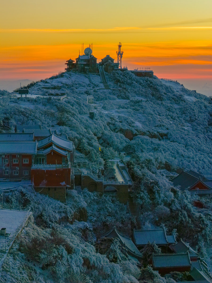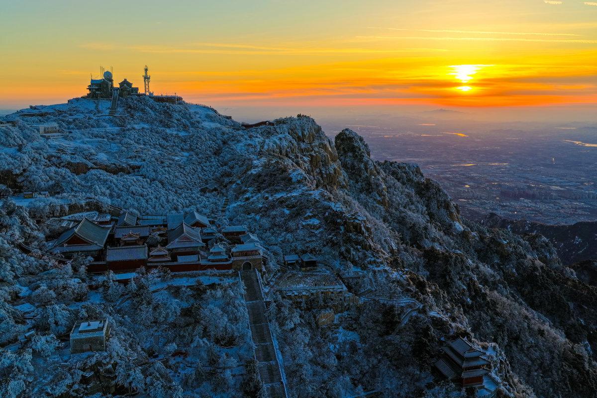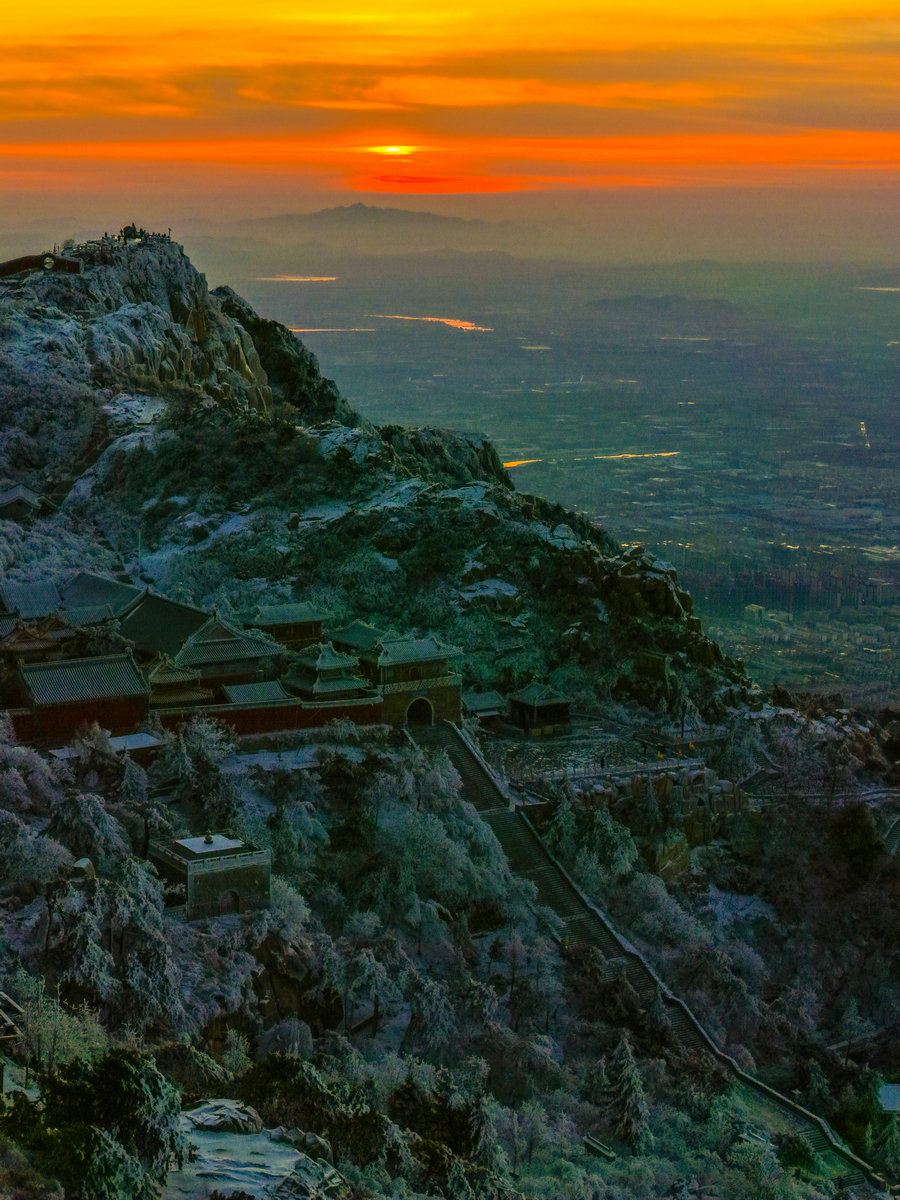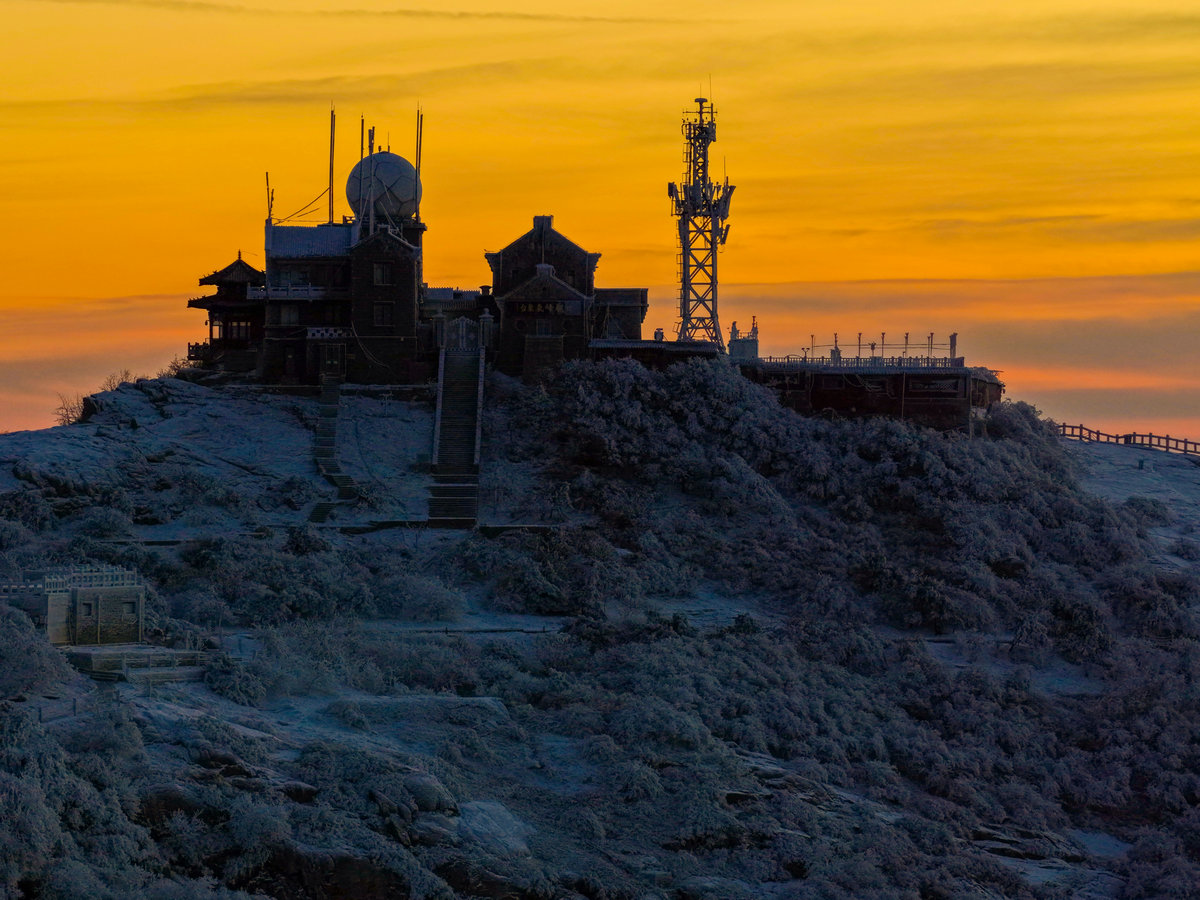 远处的山峦与城市在薄雾中若隐若现,与近处被雾凇包裹的岩石、植被形成鲜明对比——洁白的霜花在暖光的映照下折晶莹的光泽,冷峻的山岩也被镀上一层柔和的金边。