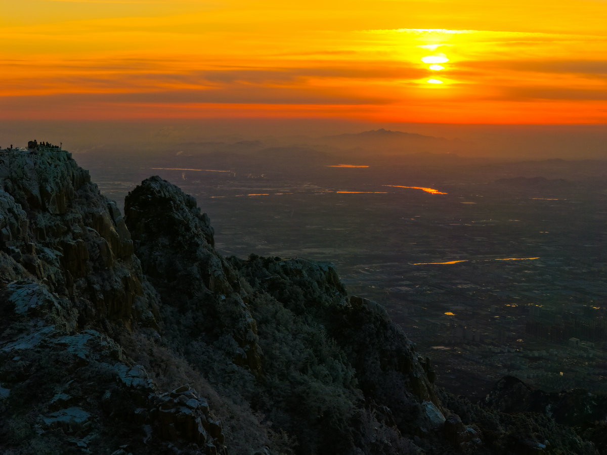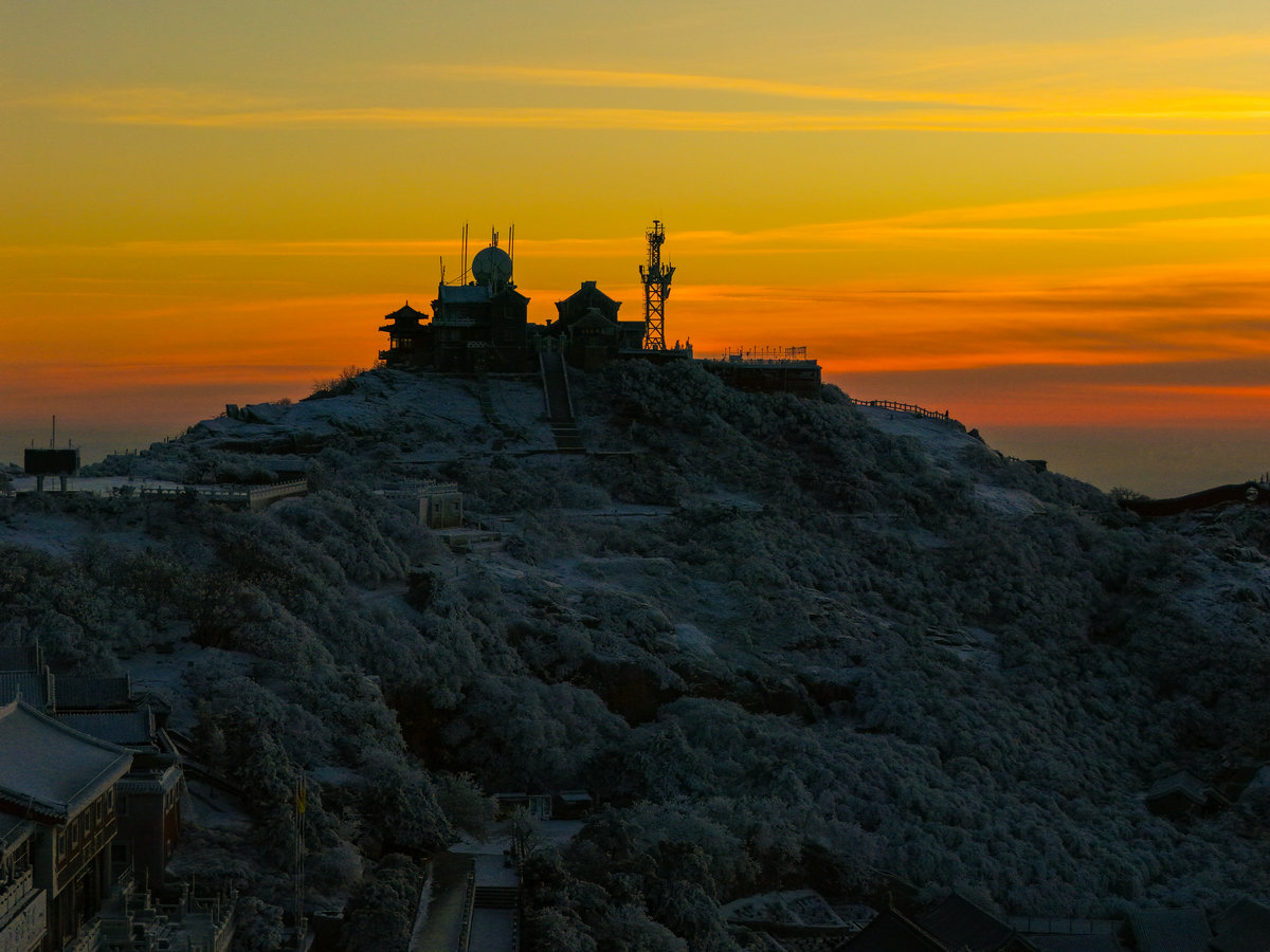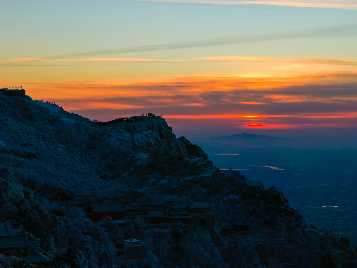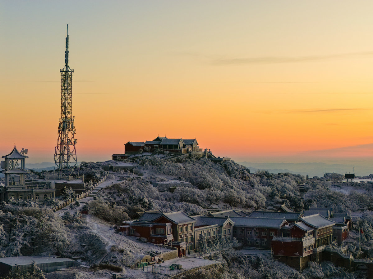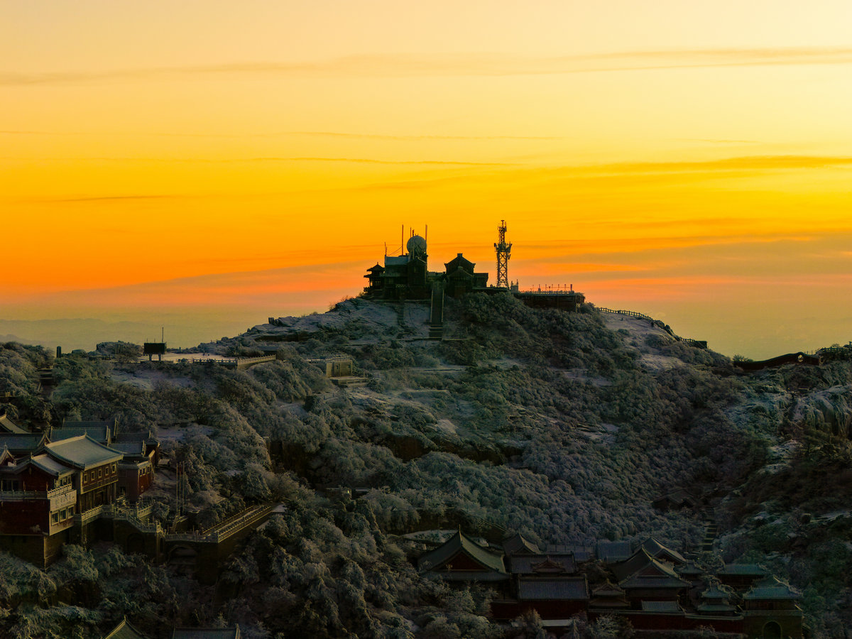 远处的山峦与城市在薄雾中若隐若现,与近处被雾凇包裹的岩石、植被形成鲜明对比——洁白的霜花在暖光的映照下折晶莹的光泽,冷峻的山岩也被镀上一层柔和的金边。