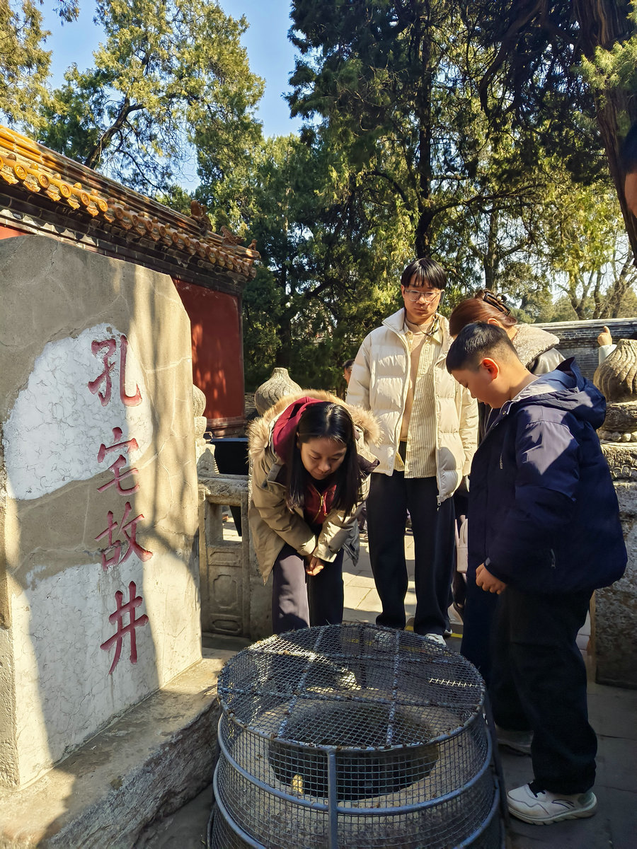 后花园的腊梅开得正好,花瓣落在青石板上,像撒了一层碎金。一对年轻情侣蹲在井边拍照,男生举着相机喊:“看这里!这口‘灵泉井’传说是孔子洗砚的地方。”女生仰头笑:“以前只在课本里见过‘曲阜’,今天才算真正走进它。”