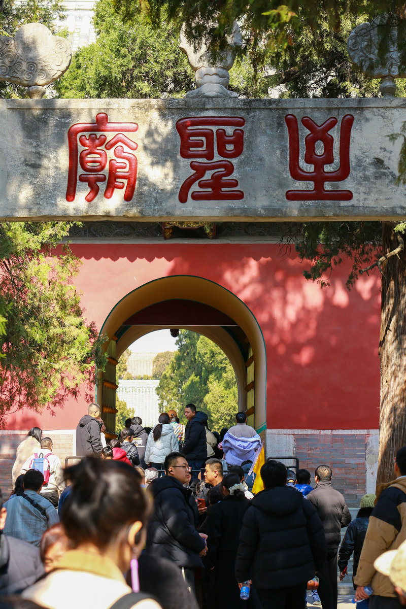 红墙黄瓦间,年味儿与古意撞了个满怀。据说,从凌晨五点开始,就有游客守在入口处,“放年假了,家里人都说出来走走,就想到来曲阜,沾沾‘圣人之气’。”来自天津的一位女生说。说话间,孩子跟着家长穿过棂星门,一起小声读着“学而时习之,不亦说乎。”