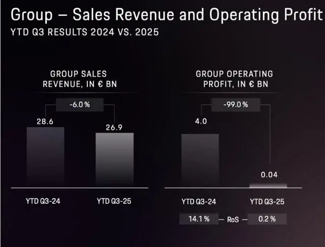 保时捷公布的财务数据清晰地揭示了这场暴跌。今年前九个月,该公司营业收入约为268.6亿欧元,同比下降6%。